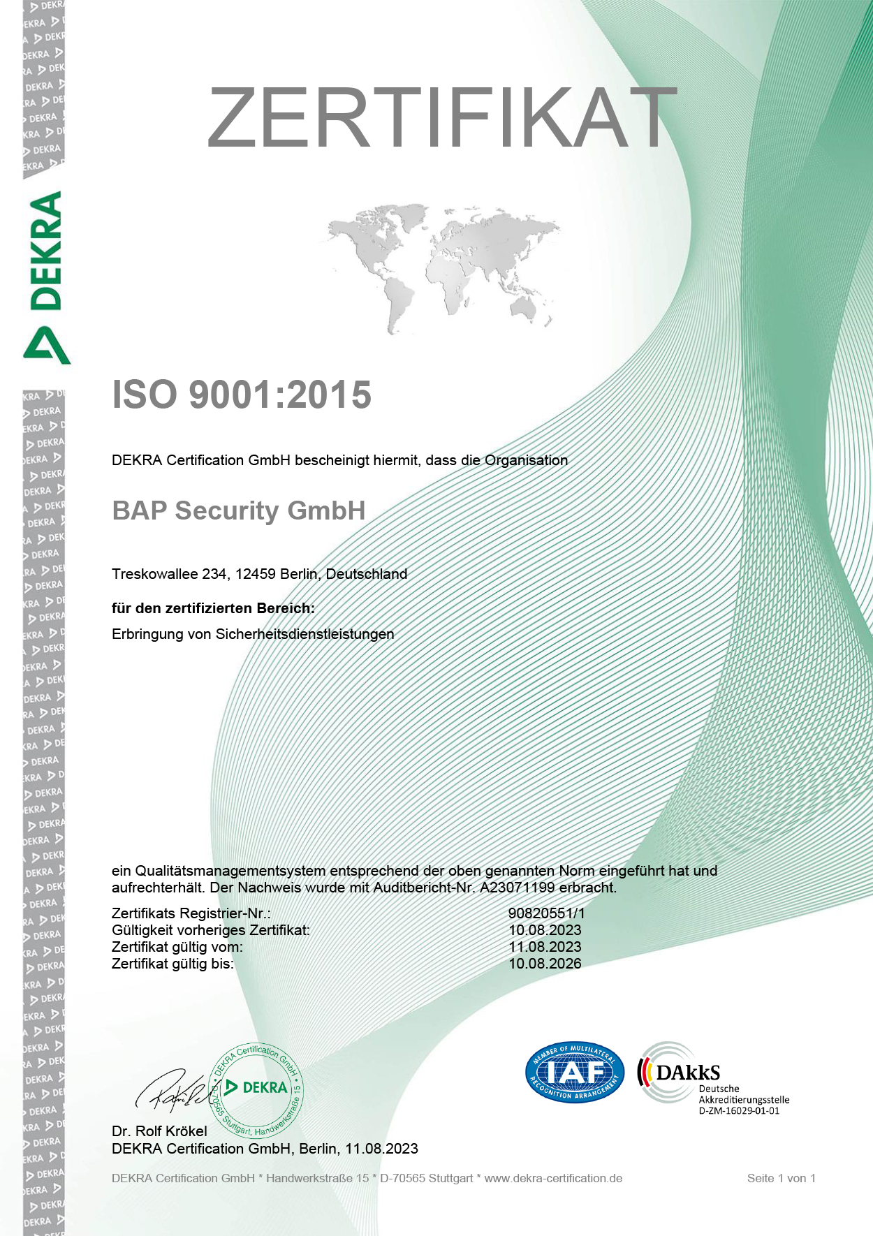 Die BAP Security GmbH ist durch die DEKRA Certification GmbH nach der international anerkannten Norm ISO 9001:2015 zertifiziert.