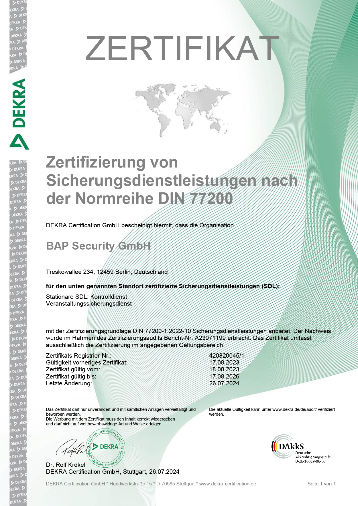 Die BAP Security GmbH ist gemäß der DIN 77200:2022-10 durch die DEKRA Certification GmbH zertifiziert.